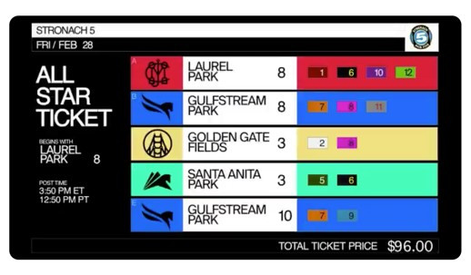 Acacia Courtney presents this. Stronach 5 All-Star Ticket. LAUREL MD Fridays Stronach 5 featuring a 50000 guaranteed pool and industry-low 12-percent takeout will feature five races -.